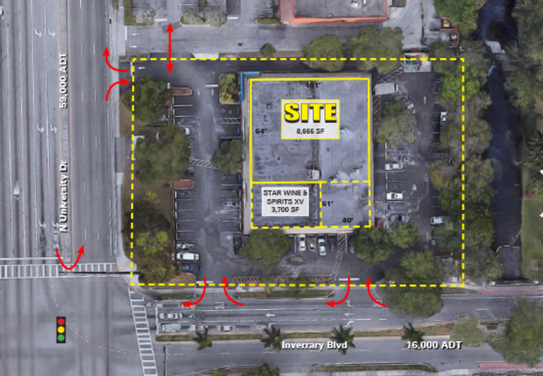 Local esquinero, desocupado, sobre la University e Inverrary, 3 espacios modificables, 48 parqueos.